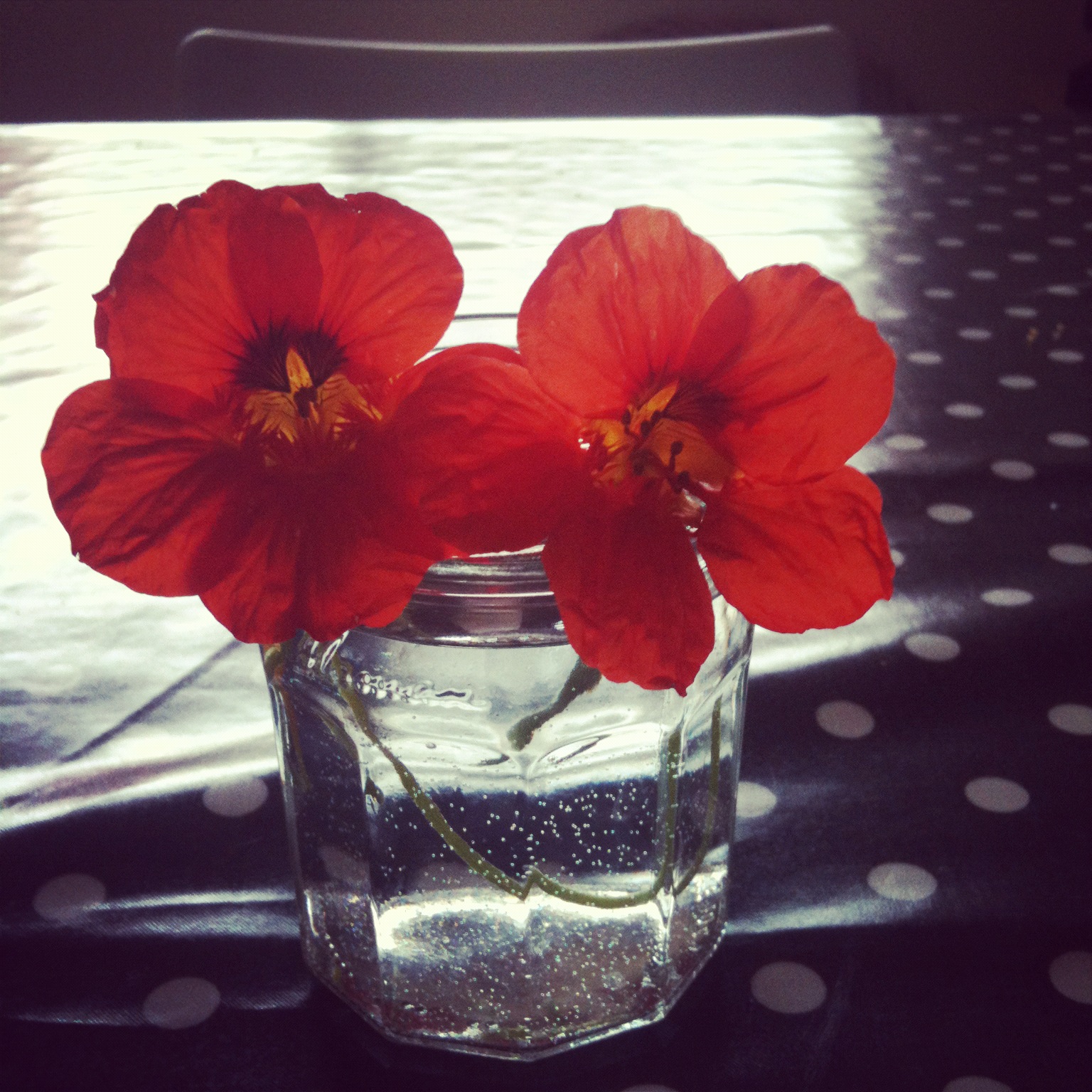 Nasturtiums are one of my favourite flowers, never thought they were vase/jar worthy – a 9 year old has shown me they are.