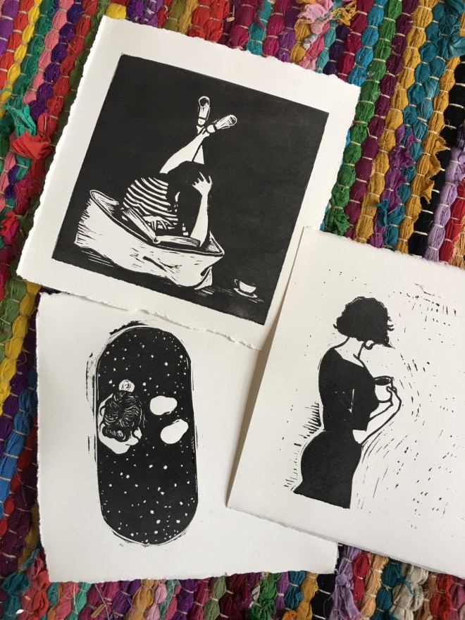 Lino printing session Had a monster printing sesh, and look what happened. Each different from the other. Each one drawn out, planned out. Cosmic girl in the tub, less so – and yet, she is the girl the people are asking for… Share this: Click to share on Pinterest (Opens in new window) Pinterest Click to share on Facebook (Opens in new window) Facebook Click to email a link to a friend (Opens in new window) Email Like Loading... Published by Emily Miss Red specialises in unearthing treasure, and if time permits; found object sculpture, mosaic & illustration. View all posts by Emily